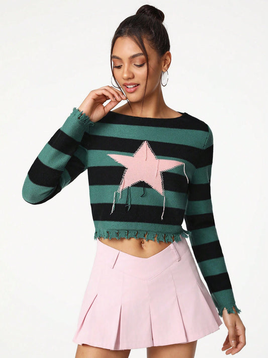 Threesuture Suéter de mujeres artista con bloque de color, patrón de rayas y estrellas, acabado desgastado, ropa de mujer para otoño e invierno