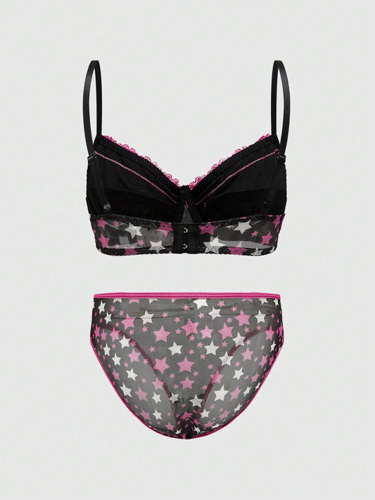 ROMWE J-Fashion Conjunto sexy de lencería Shibuya Gal con estrellas de cinco puntas y detalles de encaje y malla