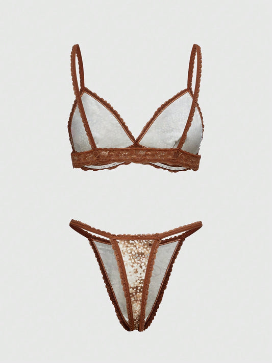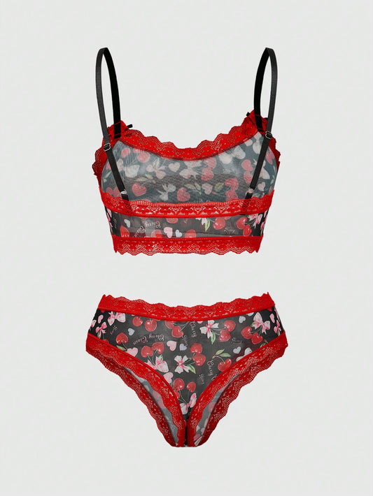 ROMWE Kawaii Conjunto de lencería transparente sin aros con estampado integral de flores de cerezo y mariposas