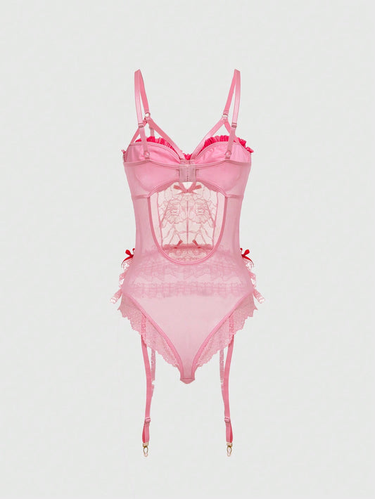ROMWE Kawaii Body Sexy De Malla De Encaje Con Lazo Y Lazo, Capa De Pastel Con Aros Y Correa Elástica