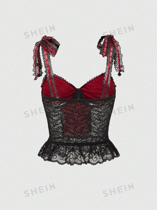 ROMWE Goth Camisola de seda roja con ribete de encaje, forro interior, diseño de cinta y flores para estrechar la cintura