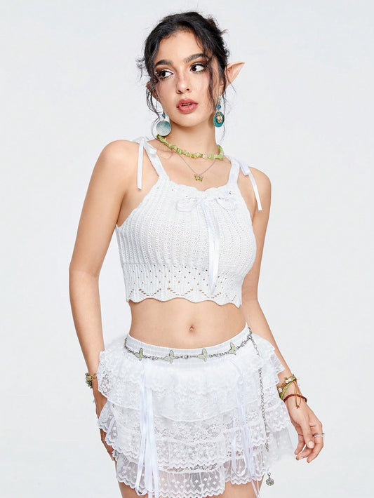 ROMWE Kawaii Mujeres Top de ganchillo sin mangas de unicolor para verano con decoración de lazo