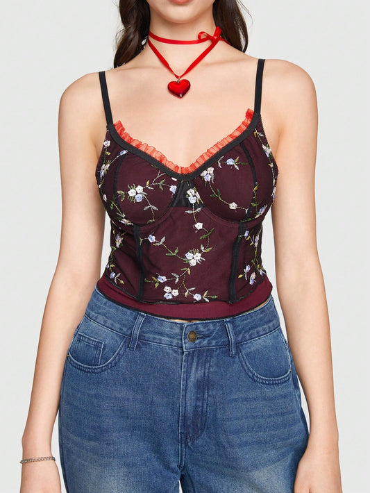 Sweetness Top Tank Doble Capa Bordado Floral Retro Para Mujer