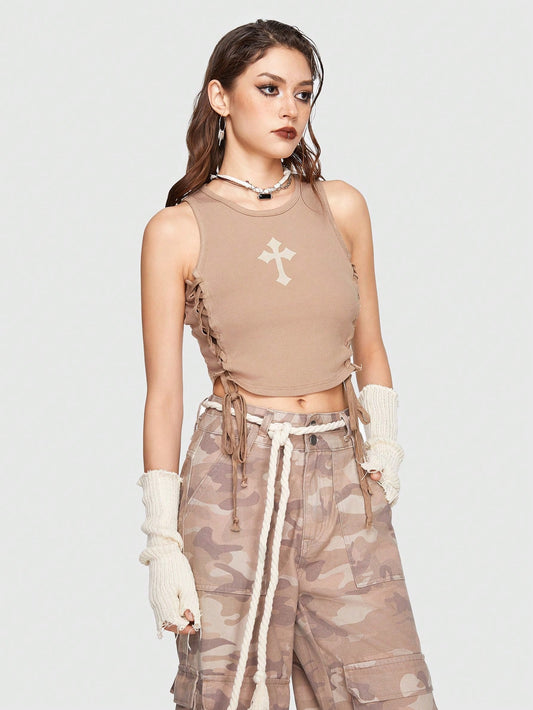 ROMWE Top tank cruzado con estampado con cordón lateral