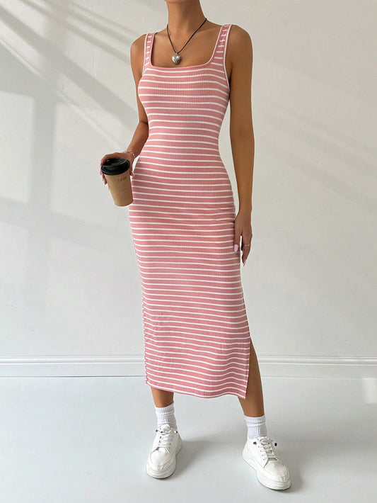 SHEIN EZwear Vestido largo con tirantes de cami, Body rayado con abertura en los muslos