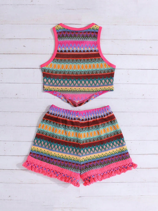 Conjunto de top de tirantes sin mangas de cuello redondo y pantalones cortos con dobladillo asimétrico para niña preadolescente de vacaciones