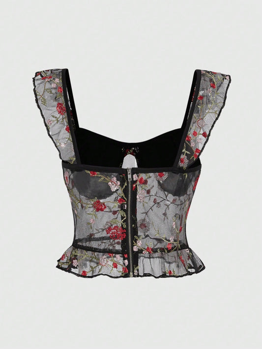 ROMWE Goth Blusa de mujer con mangas cortas, de malla bordada con rosas