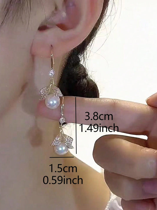 1 Par De Pendientes Deslumbrantes De Aleación De Zinc Con Hojas De Diamantes De Imitación Y Perlas Falsas Para Mujeres Para Decoración Diaria