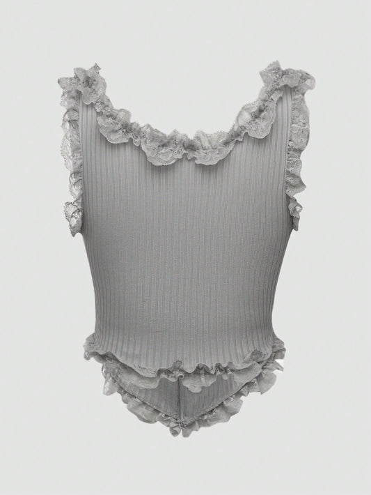 ROMWE Grunge Punk Camiseta de rayas de ajuste entallado para mujer con detalles fruncidos y ribete de encaje, escuela