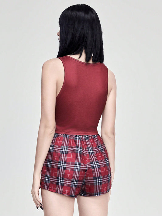 ROMWE Grunge Punk Conjunto de pijama casual de top tipo tank con estampado de araña de estilo punk rock oscuro y shorts a cuadros con lazo para mujer