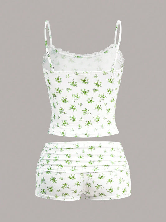 SHEIN EZwear Set de 2 piezas top de camisola y shorts con contraste de encaje y estampado floral ditsy para mujer