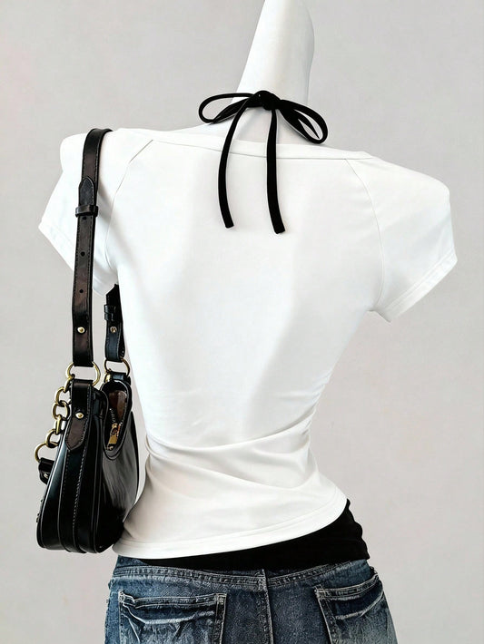 Attitoon Camiseta de mujer casual vintage de cuello en V, halter, con lazo y estampado de calavera en contraste de color, adecuada para el verano
