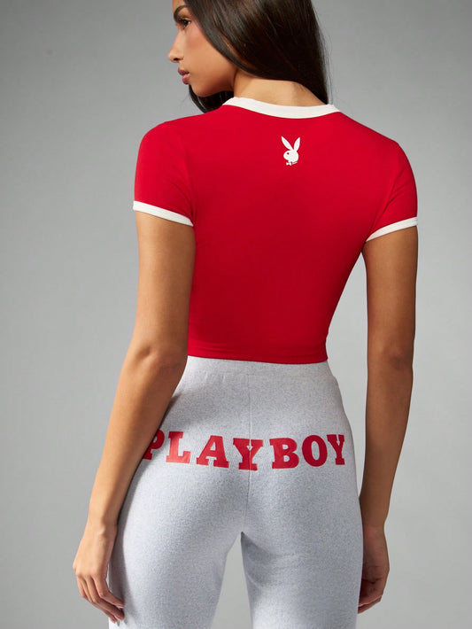 Missguided x Playboy Top corto acanalado de estilo retro, jersey deportivo universitario, estética Y2K de otoño e invierno de manga corta y ajustado