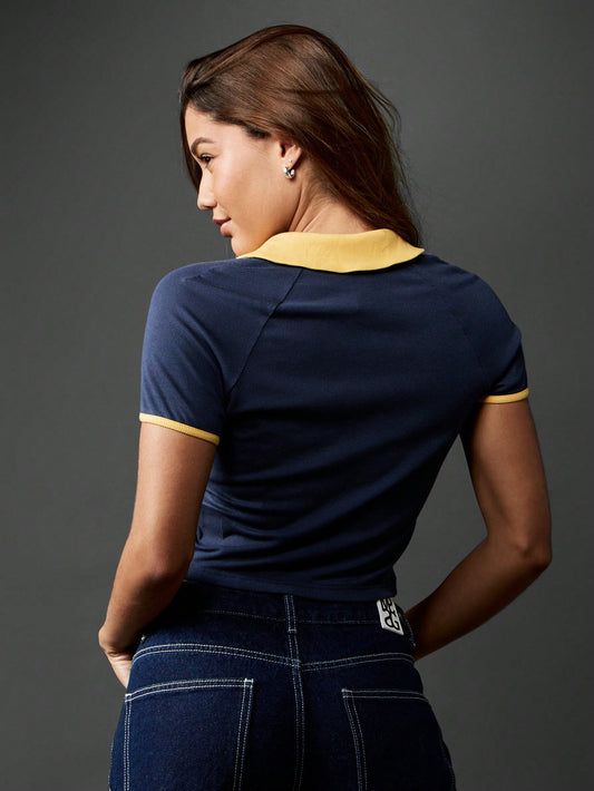 DAZY Camiseta de polo de manga corta con estampado de letras, estilo casual y elegante para mujer