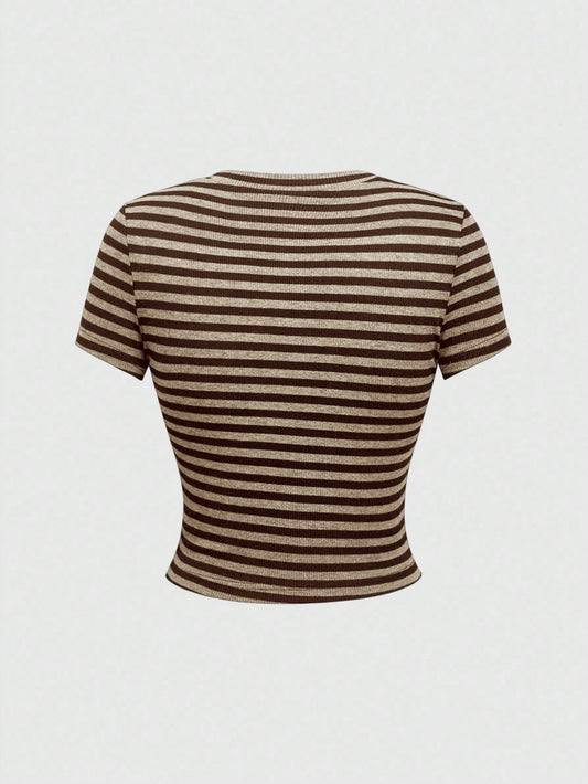 DAZY Camiseta de manga corta de rayas de ajuste ceñido para mujer, ropa de vuelta al colegio