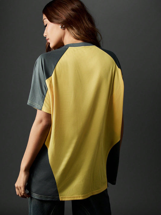 Missguided x Playboy Camiseta de estilo universitario vintage amarilla con diseño de mangas raglán de bloques de color, EST 1953, ajuste cómodo, cuello en V, look retro universitario
