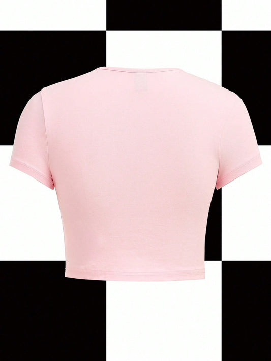Y2Kool Babi Basques Camiseta de cuello redondo ajustada y corta con eslogan en estilo Y2K de color rosa pálido, adecuada para verano, vacaciones, reuniones, fiestas y uso casual diario