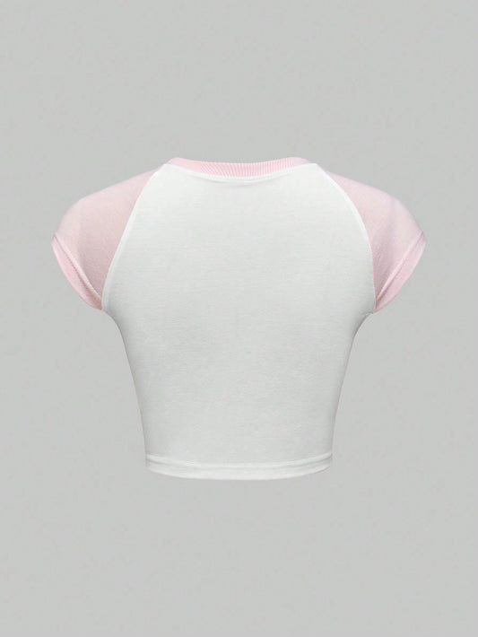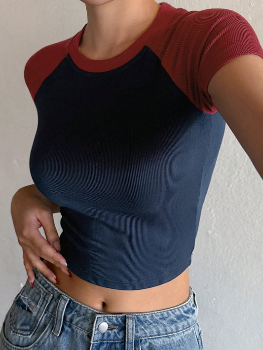 DAZY Camiseta ajustada de manga corta con mangas raglán de color block para mujer