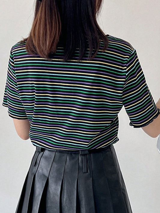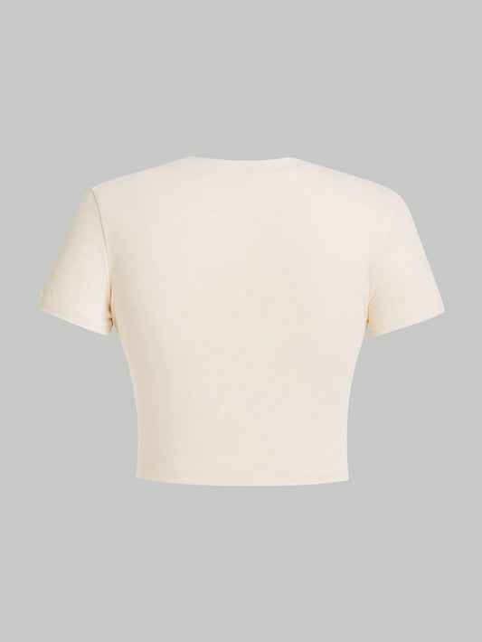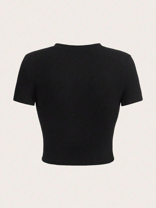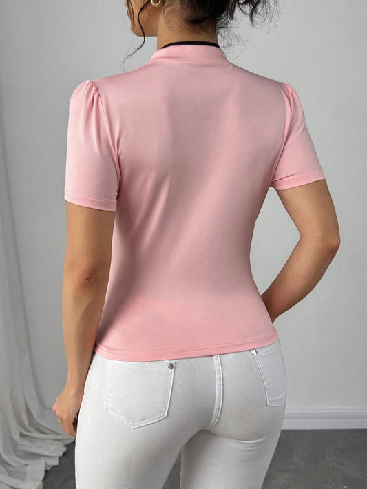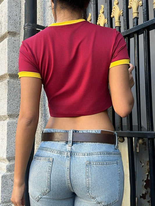 SHEIN EZwear Camiseta corta de mujer de corte ajustado con un diseño minimalista de patrón contrastante en el cuello y los puños