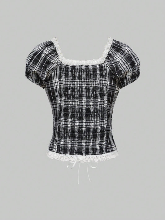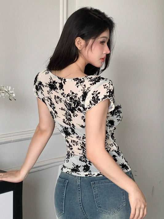 DAZY Blusa de mujer de manga corta con cuello cuadrado de malla floral y fruncido