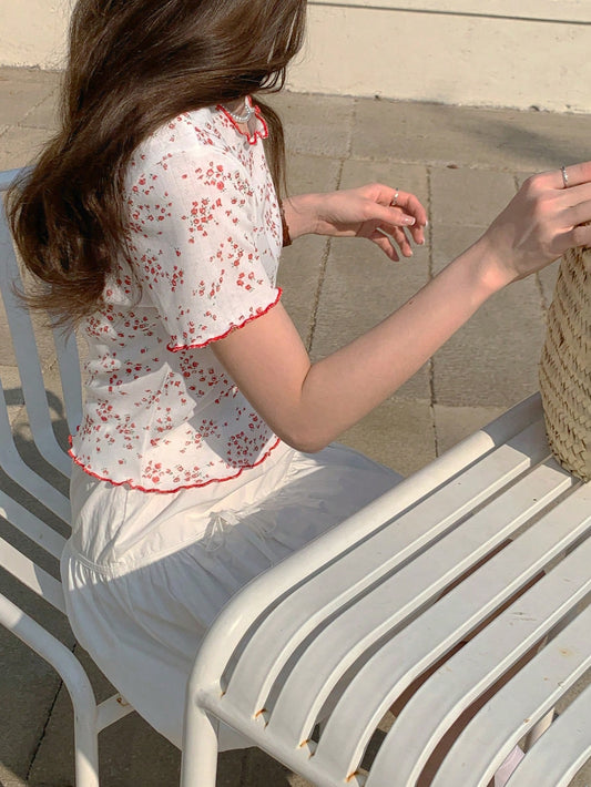 DAZY Blusa corta de cuello redondo con estampado floral y mangas cortas para mujer, color blanco, para primavera/verano