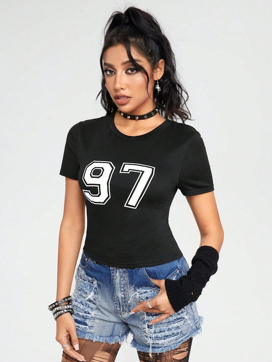 ROMWE Camiseta Casual Slim Fit De Manga Corta Elástica Con Cuello Redondo Y Estampado Digital 97, Versátil Para Mujer