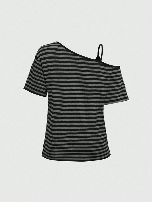 ROMWE Grunge Punk Camiseta de mujer suelta 2 en 1 con hombro oblicuo, rayas, letras y aplicación de strass en estilo dark punk