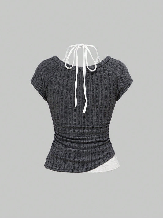 ROMWE Kawaii Camiseta ajustada con volantes y lazo delantero de mujer, con detalles de encaje, contraste y textura acanalada en color gris y estampado floral