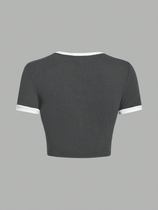 SHEIN EZwear Camiseta ajustada de mujer de corte corto, de estilo minimalista casual en color gris oscuro con cuello y puños de contraste, adecuada para el verano