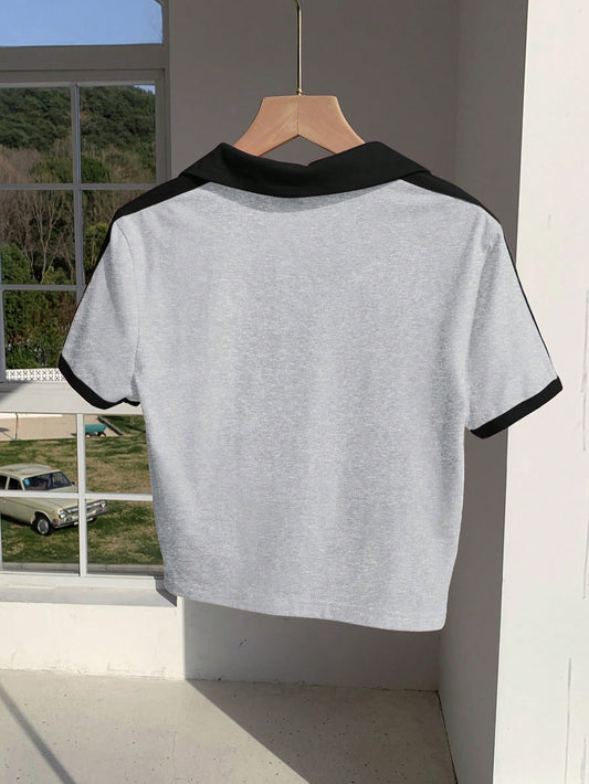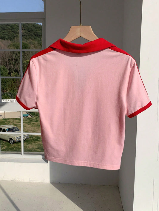 Comfortcana Camiseta de ajuste ceñido con cuello polo, estampado de contraste de color, estilo vintage americano para mujer