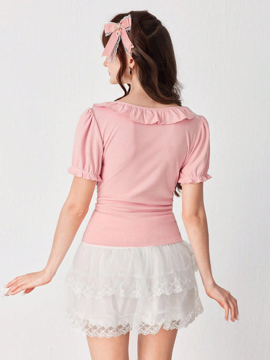 DAZY Camiseta ajustada de manga corta con cuello cuadrado, adorno de volante y lazo, de unicolor para mujer