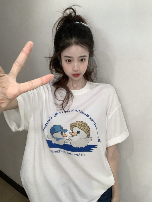 DAZY Camiseta casual de mujer con cuello redondo, estampado de dibujos animados y manga corta, tops lindos oversize, camisetas gráficas, atuendos de maestro, tops estilo preppy