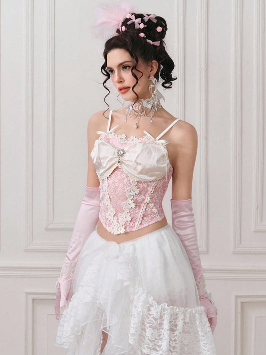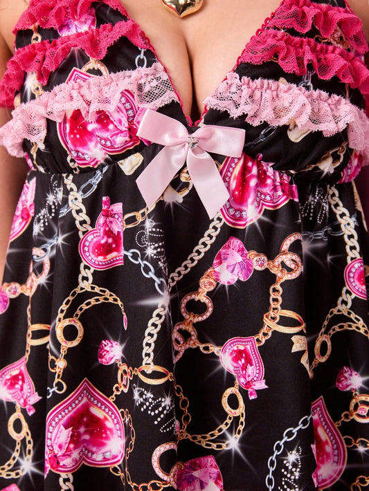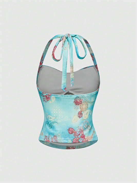 ROMWE J-Fashion Top de halter con estampado de cadena de lazo y ribete de encaje, estilo vintage y2k gal Shibuya gyaru para mujeres