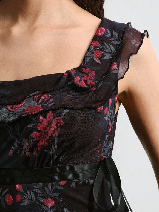 ROMWE Fairycore Top con tirantes anchos y estampado floral asimétrico vintage para mujeres