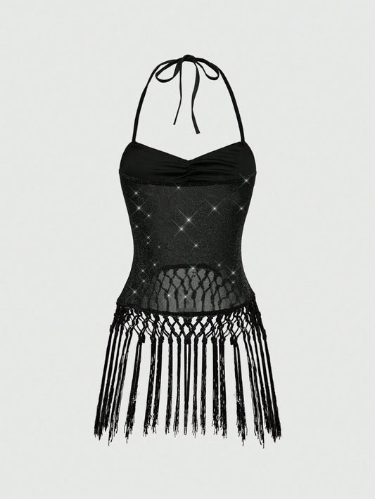 ROMWE Goth Camiseta de tirantes finos con espalda descubierta, de malla y con aplicaciones de strass, de estilo vintage y sexy, ideal para vacaciones