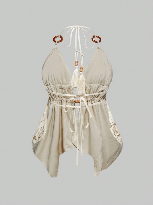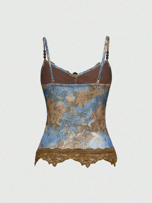 ROMWE Hippie Camiseta sin tirantes de mujer con decoración de cuentas de madera estilo hippie vintage, patchwork de encaje y estampado de paisley