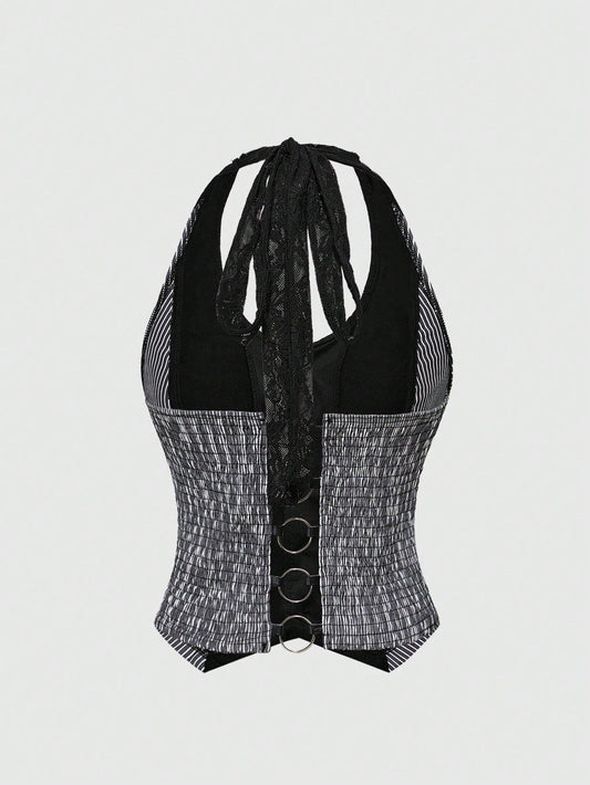 ROMWE J-Fashion Blazer a rayas con estilo retro Y2K Harajuku, top sin espalda con decoración metálica y halter de encaje en contraste para mujeres