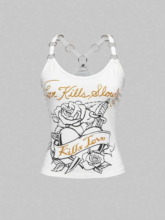 ROMWE J-Fashion Top de mujer tipo tank con estampado de rosa corazón retro Y2K, patrón metálico de cebra y parches