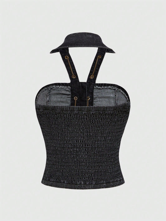 ROMWE J-Fashion Top de tirantes de denim con cremallera delantera y diseño de ojetes para mujer