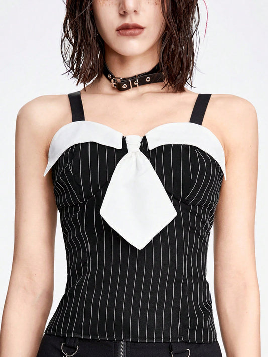 ROMWE Mujeres Top de verano de cuello halter con tiras de color contrastante y corbata decorativa en el cuello