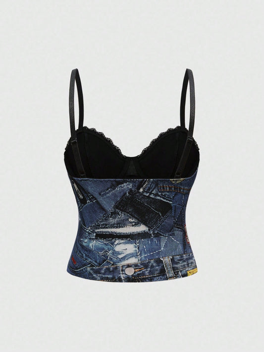 ROMWE Top de tirantes de mujer con efecto de tela vaquera vintage, con parches de encaje y cremallera de malla