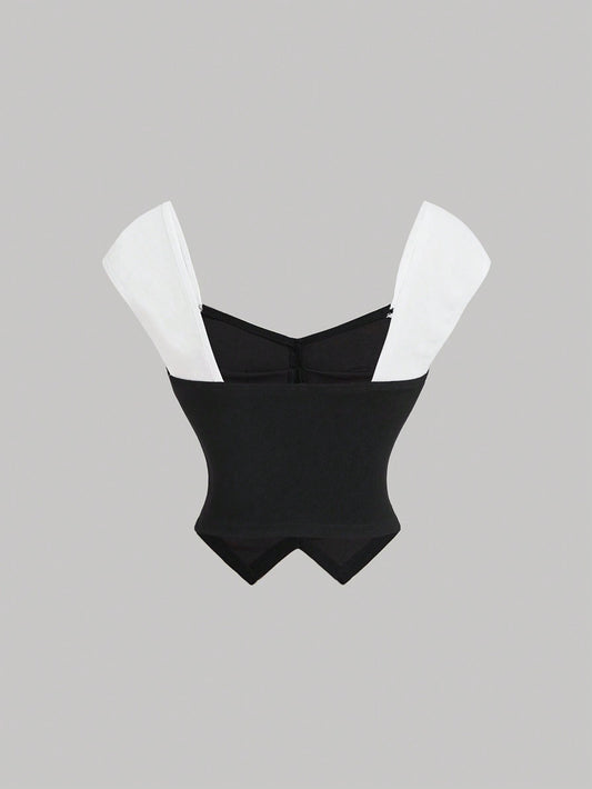 SHEIN MOD Camiseta corta de cuello en V con volantes asimétricos vintage, camiseta ajustada con cuello en V y botones de mujer, color negro, ropa de otoño, estilo old money