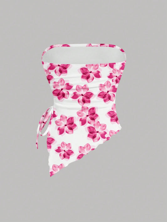 SHEIN MOD Top bandeau con estampado floral minimalista y bajo asimétrico para mujer