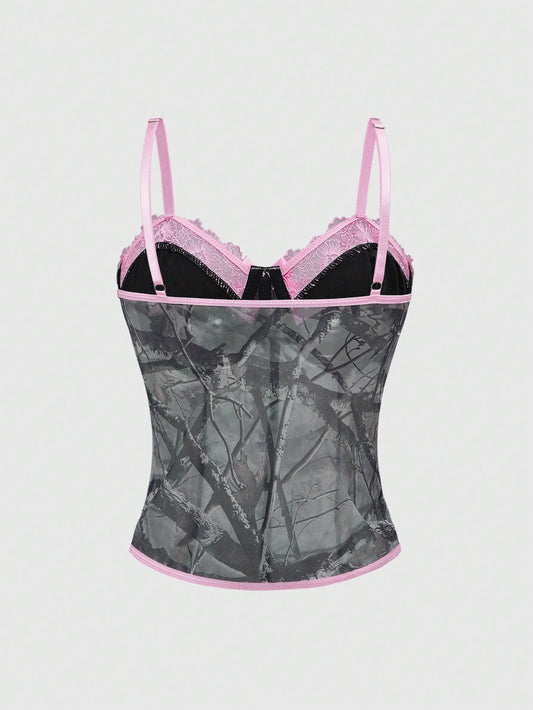 ROMWE Grunge Punk Top de tirantes de malla con adorno de encaje y camuflaje de hojas secas estilo Y2K