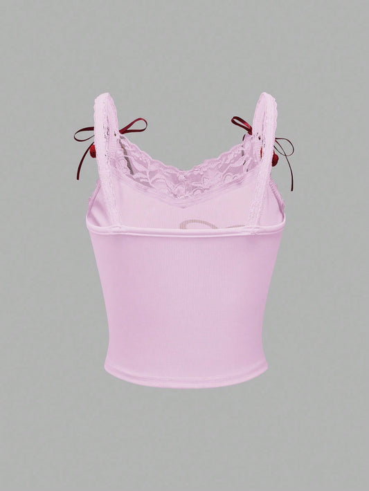 ROMWE Kawaii Camiseta de tirantes casual de mujer con estampado de cerezas y ribete de encaje