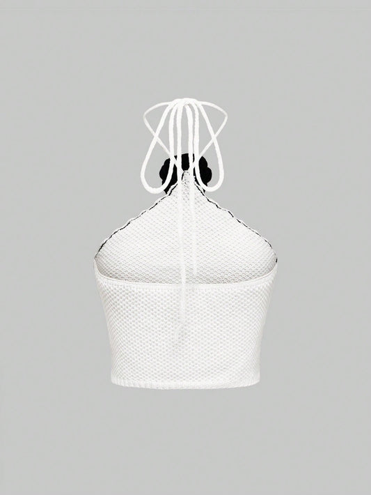 ROMWE Kawaii Parte superior de punto sin mangas con cuello halter y decoración floral para mujer