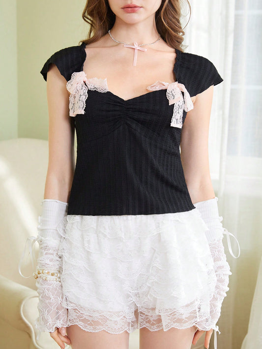 ROMWE Kawaii Playera elegante de mujer KawaiiSweetness con ajuste delgado, inspirada en el ballet, con textura de encaje de princesa sexy y chic