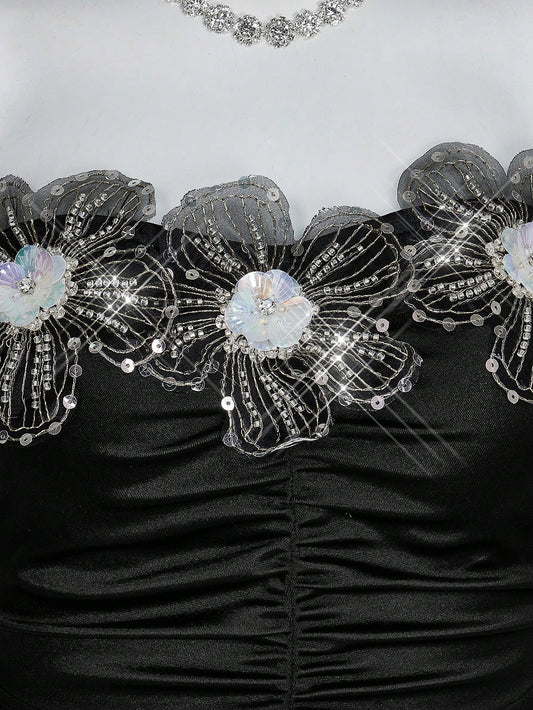 Sweetina 1 pieza Top bandeau plisada con decoración floral de gemas metálicas 3D