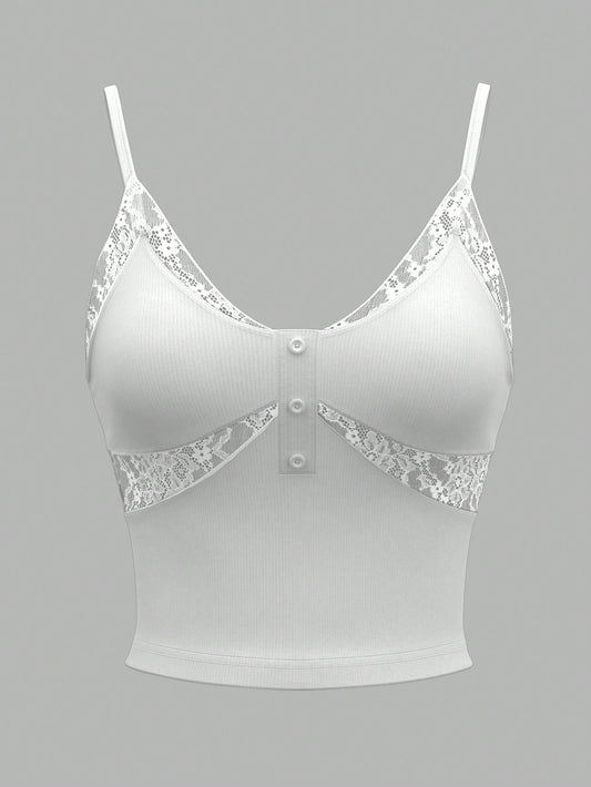 Sweetina Top de canesú con encaje en estilo primaveral, blanco, de corte ceñido