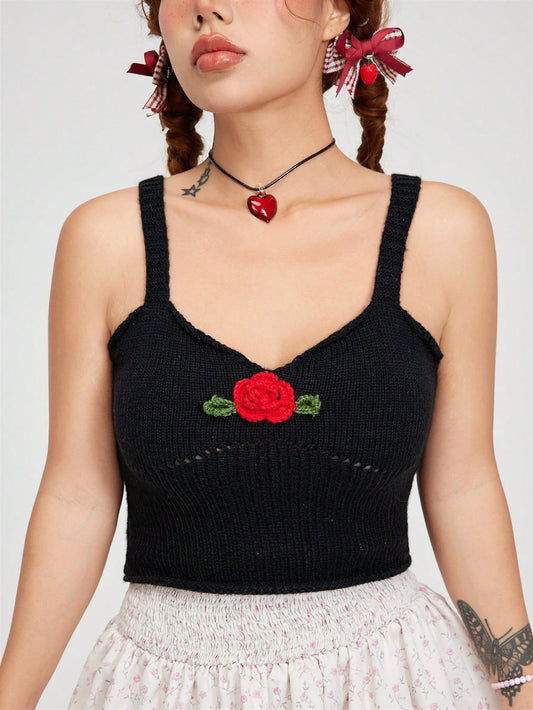 ROMWE Kawaii Top de punto de verano para mujer dulce y encantador decorado con rosas
